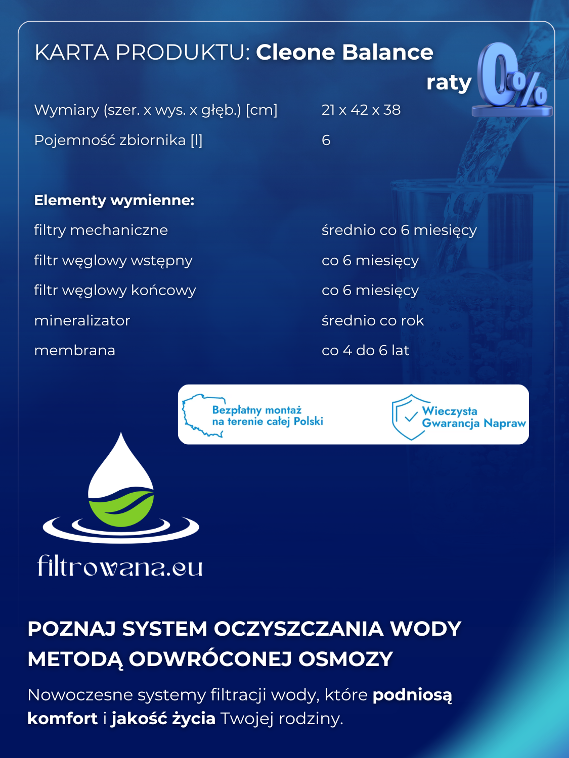 To nowoczesne urządzenie do filtracji wody, które potrafi dostarczyć aż 190 litrów krystalicznie czystej wody dziennie. Dzięki pięciostopniowemu systemowi oczyszczania usuwa niemal wszystkie zanieczyszczenia — aż 99,99% — dzięki czemu woda jest nie tylko bezpieczna, ale i naprawdę smaczna.